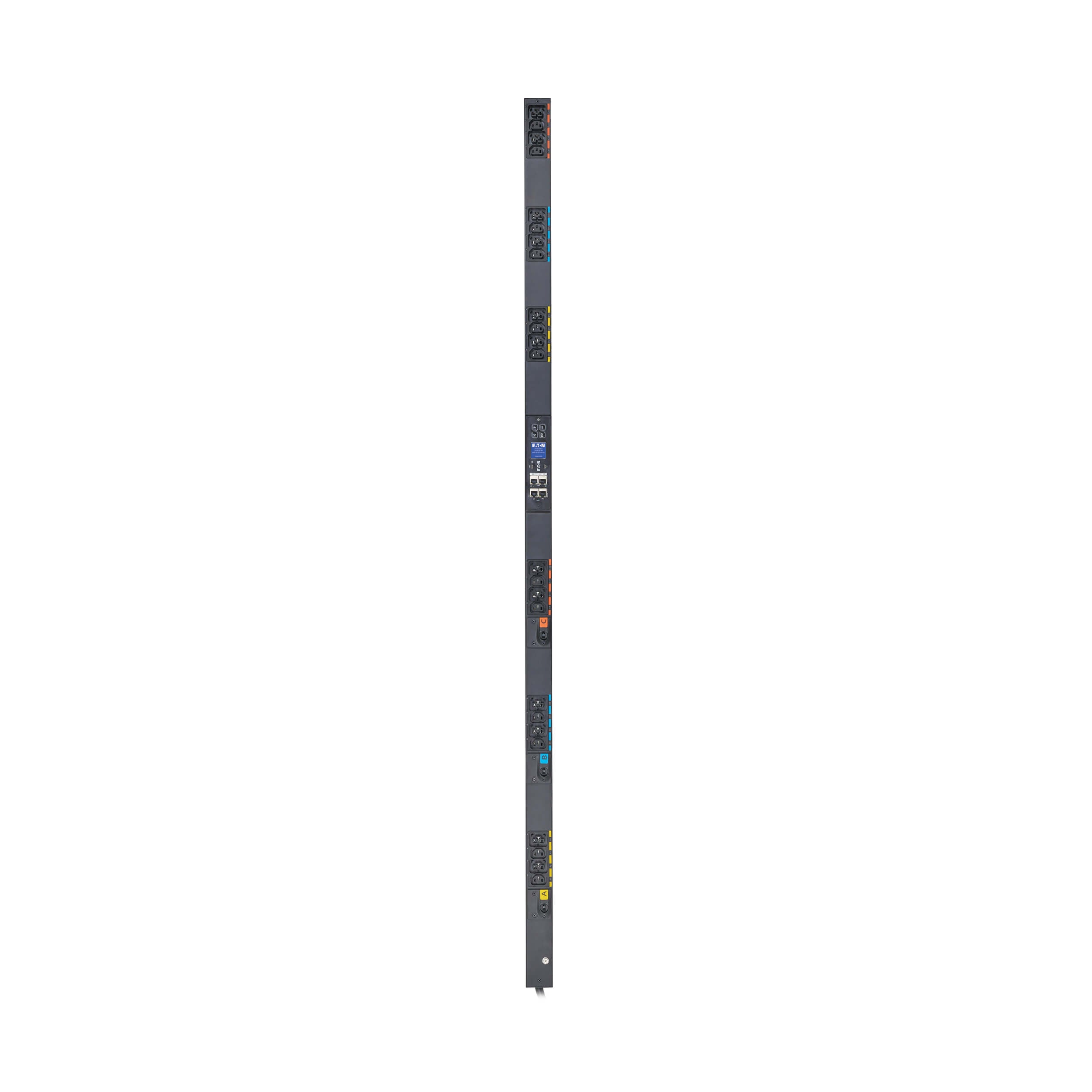 The Eaton EVMA1530A Managed PDU is a vertical, rack-mount power distribution unit designed to deliver reliable, Three-phase 208V power to multiple devices in server racks, network closets or data centers. It lets you remotely switch individual outlets to reboot devices or disable unused ports, while offering outlet-level monitoring with 1% billing-grade accuracy for precise energy tracking. A hot-swappable network management module and an easy-to-read LCD make setup and service simple, and Eaton’s integrated IEC outlet grips keep plugs firmly in place to prevent accidental disconnects.
