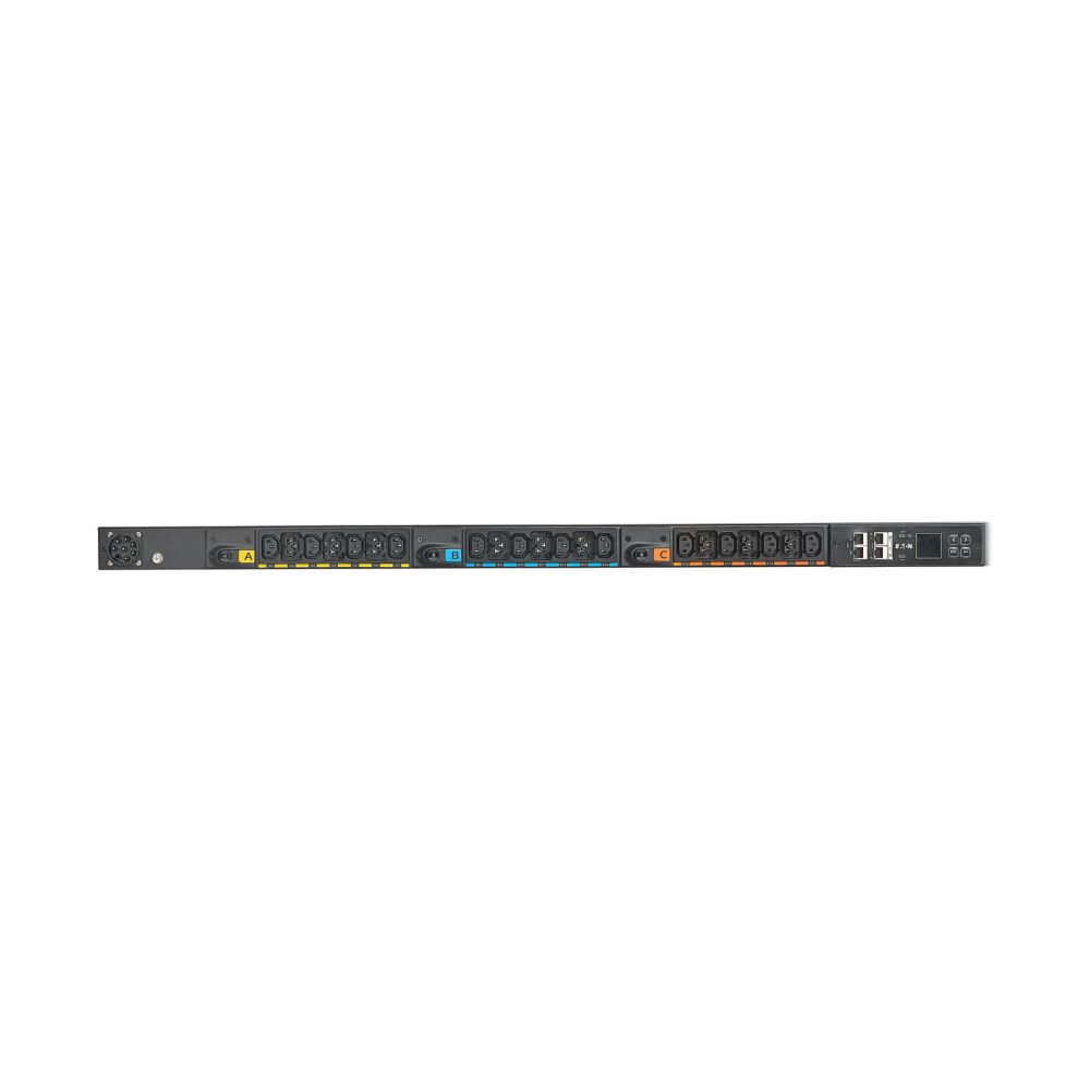 The Eaton EVMAGU23X Managed PDU is a vertical, rack-mount power distribution unit designed to deliver reliable, Single or Three-phase 200-415V power to multiple devices in server racks, network closets or data centers. It lets you remotely switch individual outlets to reboot devices or disable unused ports, while offering outlet-level monitoring with 1% billing-grade accuracy for precise energy tracking. A hot-swappable network management module and an easy-to-read LCD make setup and service simple, and Eaton’s integrated IEC outlet grips keep plugs firmly in place to prevent accidental disconnects.